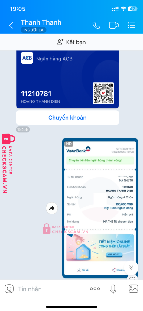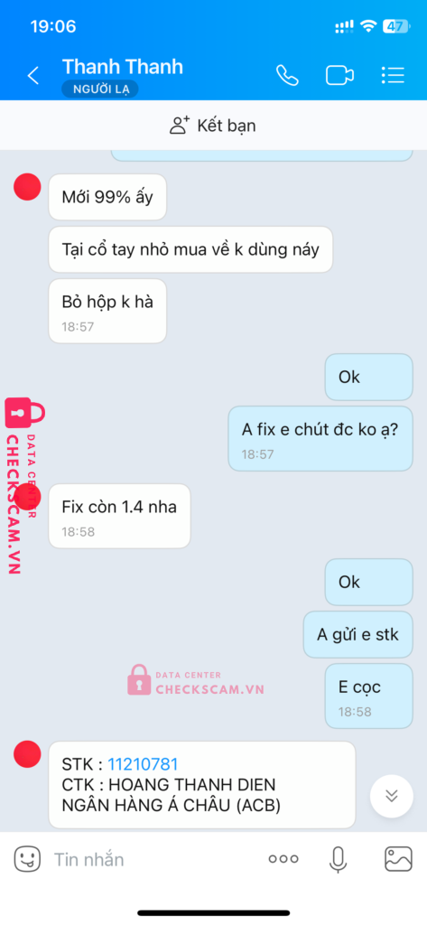 Scammer Alert: HOANG THANH DIEN Reported: November 16, 2024 Scammer Information Full Name: HOANG THANH DIEN Payment Gate: ACB_NH TMCP A Chau Payment Account: 11210781 Category: Marketplace scams Source: Checkscam Evidence Files Report Description M mua đồng hồ Huawei GT2 Sport, ở xa nên m yêu cầu Shipcod, cái nó bắt cọc 100k, rồi lân la hết ngày, xong nó chặn Comments Your comment Add Comment No comments yet. Be the first to share your experience with this scammer.