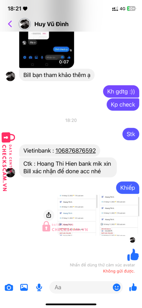 Scammer Alert: HOANG THI HIEN Reported: November 16, 2024 Scammer Information Full Name: HOANG THI HIEN Payment Gate: Viettinbank Payment Account: 106876876592 Category: Marketplace scams Source: Checkscam Evidence Files Report Description Lấy lòng tin làm người kiểm duyệt để lừa đảo Comments Your comment Add Comment No comments yet. Be the first to share your experience with this scammer.