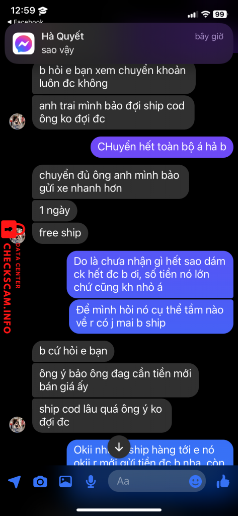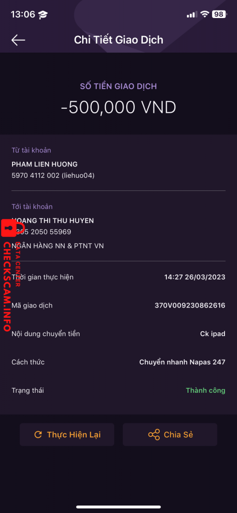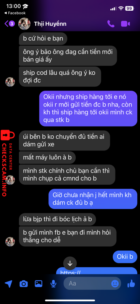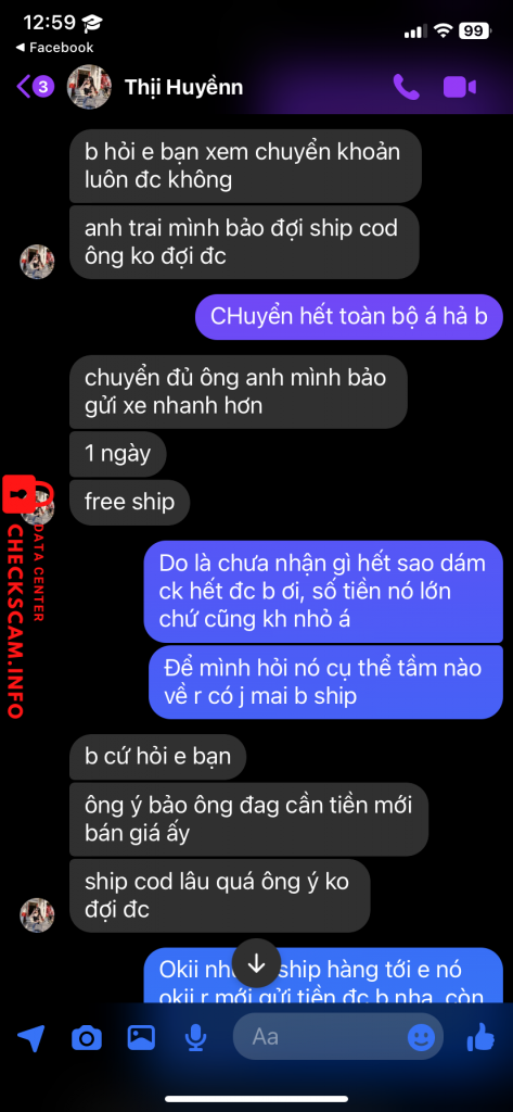 Scammer Alert: Hoang thi thu huyen Reported: November 16, 2024 Scammer Information Full Name: Hoang thi thu huyen Payment Gate: Agribank Payment Account: 8305205055969 Category: Marketplace scams Source: Checkscam Evidence Files Report Description Bán ipad giá rẻ lừa tiền, có 2 người là nó và anh nó Comments Your comment Add Comment No comments yet. Be the first to share your experience with this scammer.
