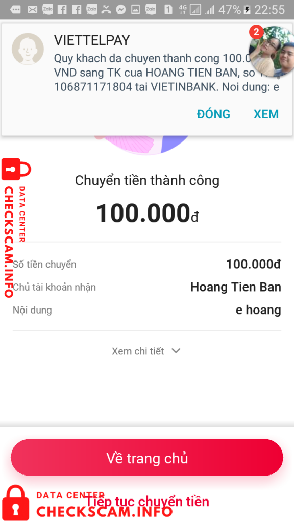 Scammer Alert: Hoang Tien Ban Reported: November 16, 2024 Scammer Information Full Name: Hoang Tien Ban Payment Gate: Viettinbank Payment Account: 106871171804 Category: Marketplace scams Source: Checkscam Evidence Files Report Description Mình bị lừa mua 5$ và rất tức Comments Your comment Add Comment No comments yet. Be the first to share your experience with this scammer.