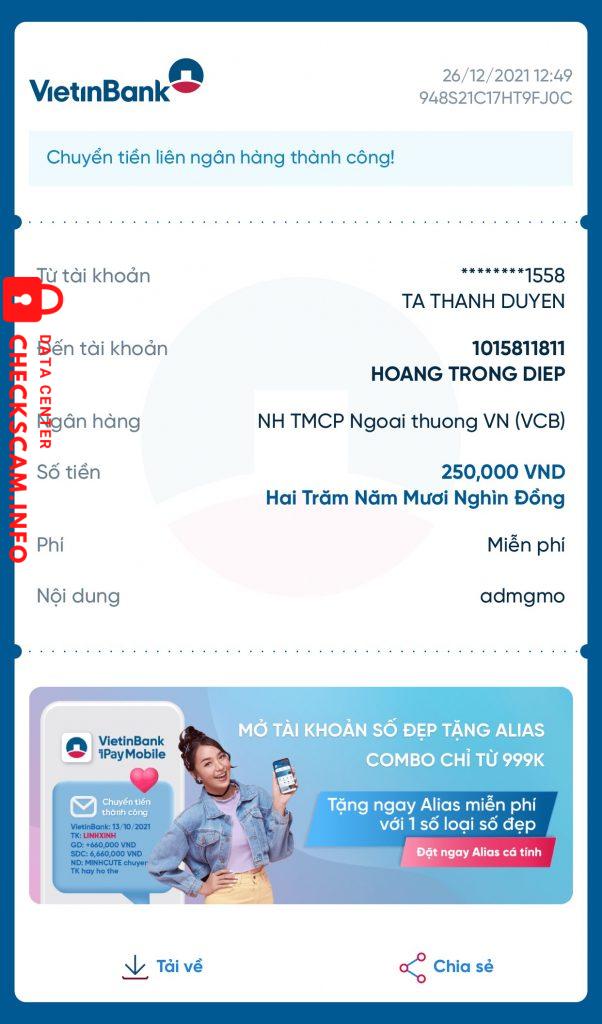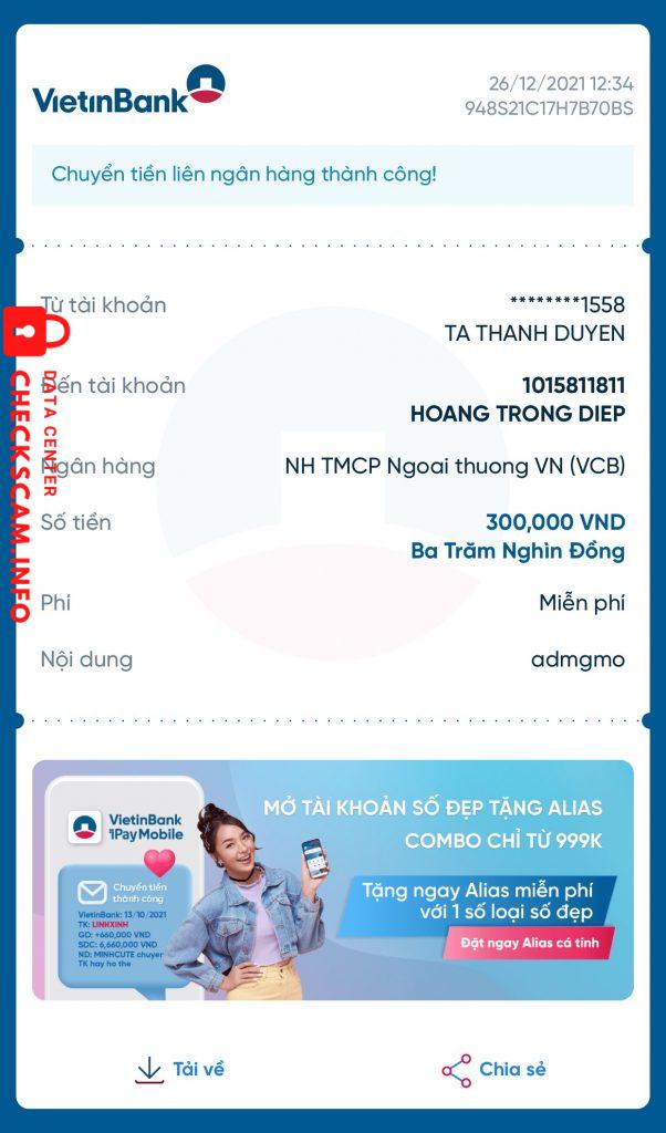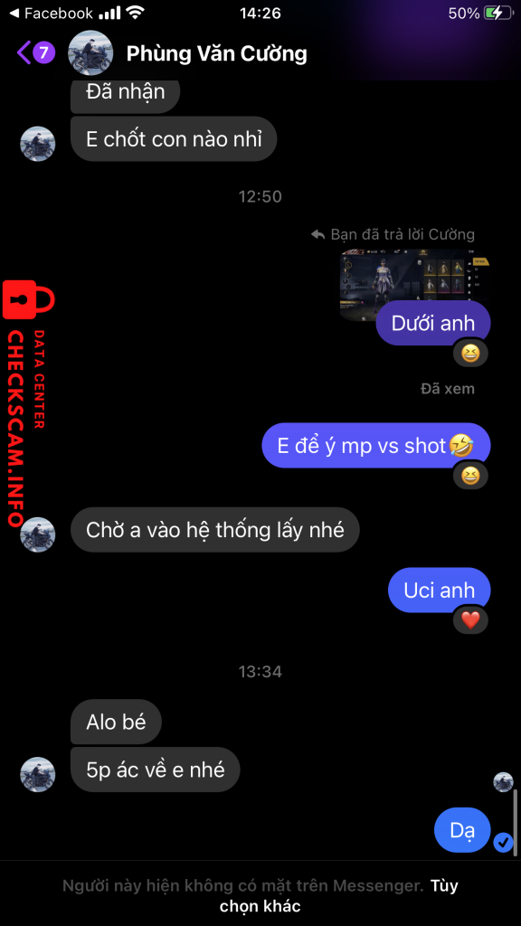 Scammer Alert: Hoàng Trọng Điệp Reported: November 16, 2024 Scammer Information Full Name: Hoàng Trọng Điệp Payment Gate: Vietcombank Payment Account: 1015811811 Category: Marketplace scams Source: Checkscam Evidence Files Report Description Scam tiền mua acc Comments Your comment Add Comment No comments yet. Be the first to share your experience with this scammer.