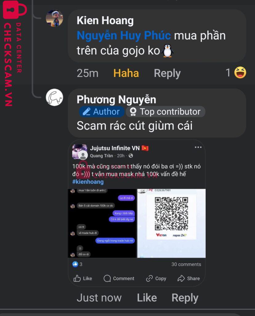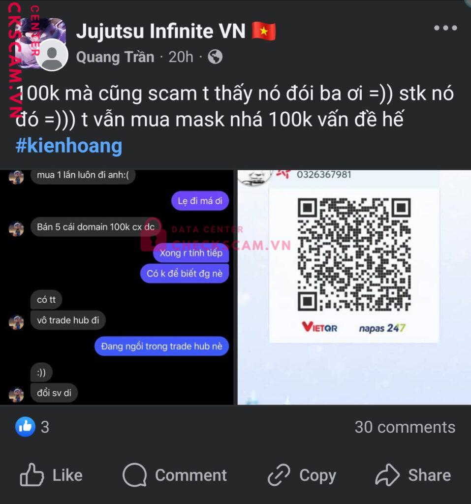 Scammer Alert: HOANG TRUNG KIEN Reported: March 7, 2025 Scammer Information Full Name: HOANG TRUNG KIEN Payment Gate: Mb bank Payment Account: 0326367981 Category: Marketplace scams Source: Checkscam Evidence Files Report Description Lừa đảo trong group, bản thân cũng đã tự nhận là scammer Comments Your comment Add Comment No comments yet. Be the first to share your experience with this scammer.