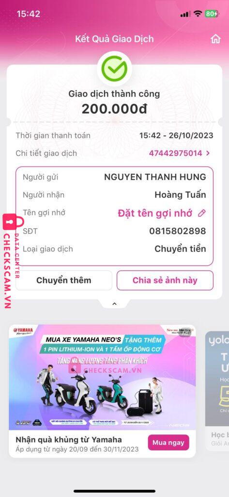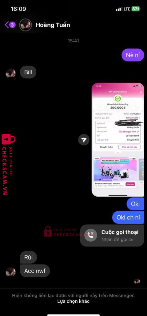Scammer Alert: Hoàng Tuấn Reported: November 16, 2024 Scammer Information Full Name: Hoàng Tuấn Payment Gate: Momo Payment Account: 0815802898 Category: Marketplace scams Source: Checkscam Evidence Files Report Description Đối tượng scam 200k Comments Your comment Add Comment No comments yet. Be the first to share your experience with this scammer.