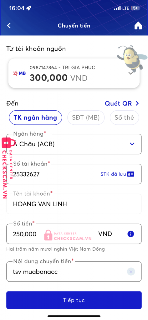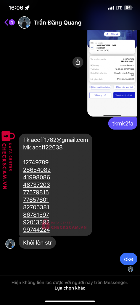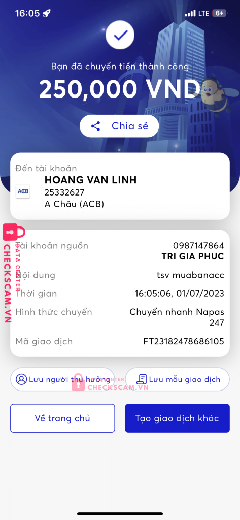Scammer Alert: HOANG VAN LINH Reported: November 16, 2024 Scammer Information Full Name: HOANG VAN LINH Payment Gate: Á Châu ( ACB ) Payment Account: 25332627 Category: Marketplace scams Source: Checkscam Evidence Files Report Description MỌI NGƯỜI CHÚ Ý KẺ FAKE AD Comments Your comment Add Comment No comments yet. Be the first to share your experience with this scammer.