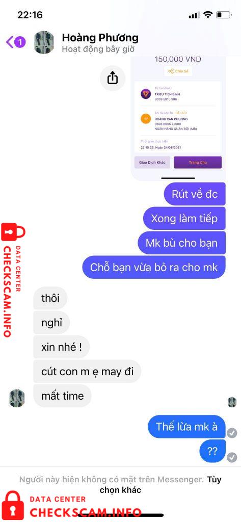 Scammer Alert: Hoang Van Phuong Reported: November 16, 2024 Scammer Information Full Name: Hoang Van Phuong Payment Gate: MB Payment Account: 0608685572000 Category: Marketplace scams Source: Checkscam Evidence Files Report Description lừa đảo chiếm đoạt tài sản, Mọi người cẩn thận bác này lừa đảo ăn mới bị lừa mất 300k Comments Your comment Add Comment No comments yet. Be the first to share your experience with this scammer.