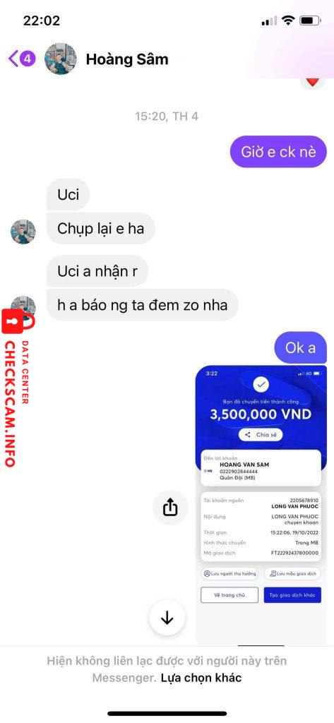 Scammer Alert: Hoàng Văn Sâm Reported: November 16, 2024 Scammer Information Full Name: Hoàng Văn Sâm Phone Number: 0868484888 Payment Gate: MBBANK Payment Account: 0222902844444 Category: Marketplace scams Source: Checkscam Evidence Files Report Description Cọc tiền mua điện thoại . Xong chặn Comments Your comment Add Comment No comments yet. Be the first to share your experience with this scammer.