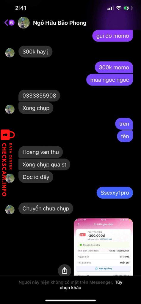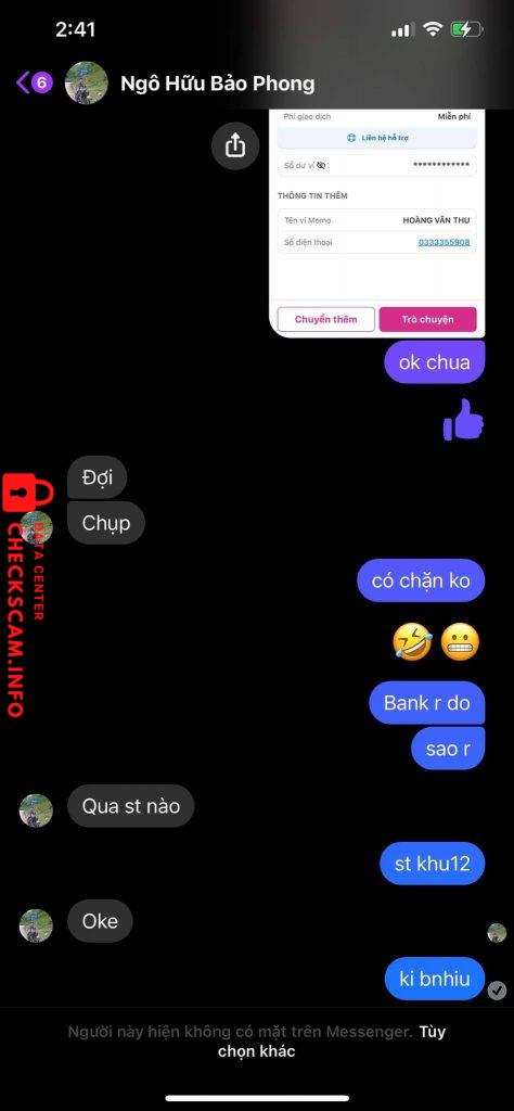 Scammer Alert: Hoàng Văn Thu Reported: November 16, 2024 Scammer Information Full Name: Hoàng Văn Thu Phone Number: 0333355908 Payment Gate: MoMo Payment Account: 0333355908 Category: Marketplace scams Source: Checkscam Evidence Files Report Description Tố cáo hộ ở game ngọc rồng online Comments Your comment Add Comment No comments yet. Be the first to share your experience with this scammer.