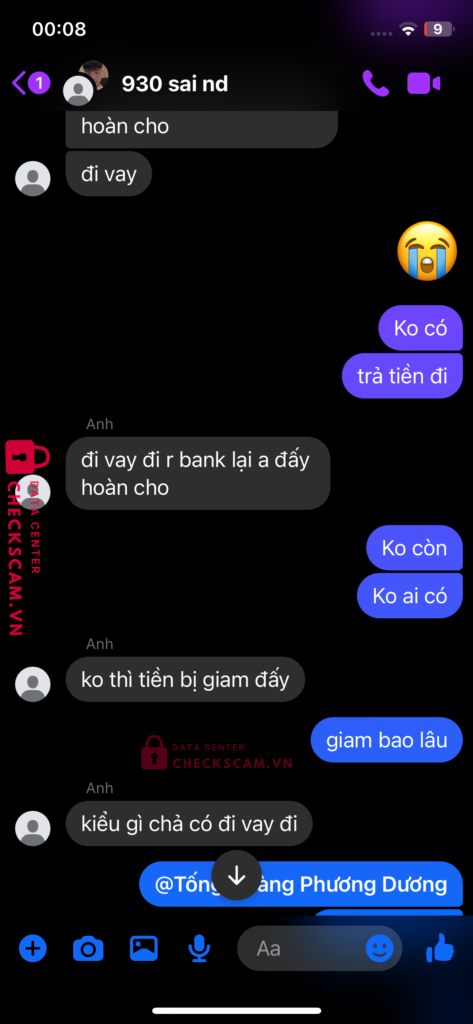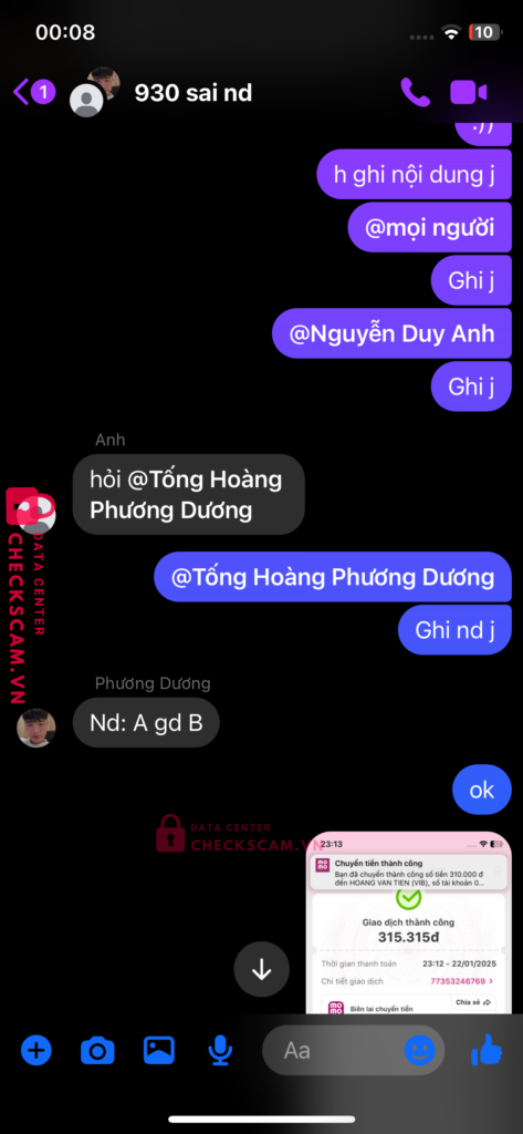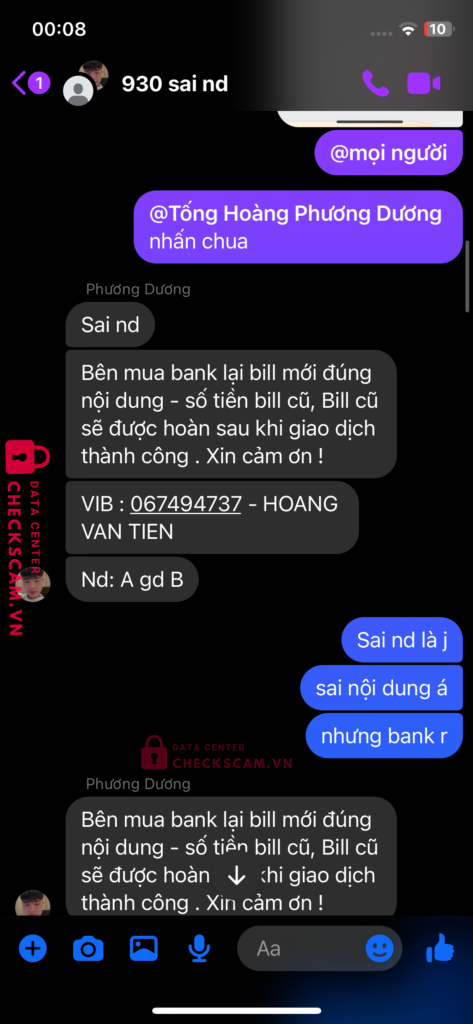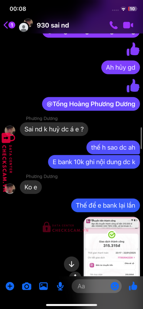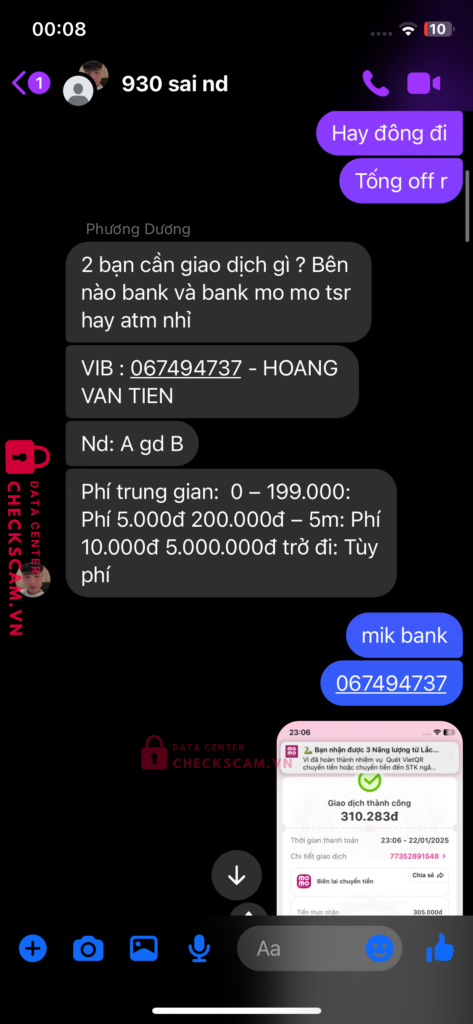 Scammer Alert: HOANG VAN TIEN Reported: March 7, 2025 Scammer Information Full Name: HOANG VAN TIEN Payment Gate: ViB Payment Account: 067494737 Category: Marketplace scams Source: Checkscam Evidence Files Report Description Lừa đảo cọc tiền giao dịch trung gian. Bắt chuyển khoản nhiều lần . Giả vờ sai nội dung sai số tiền và bắt chuyển lại liên tục Comments Your comment Add Comment No comments yet. Be the first to share your experience with this scammer.