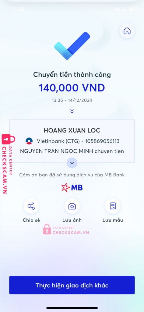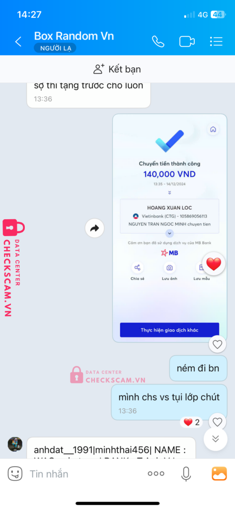 Scammer Alert: Hoàng Xuân Lộc Reported: March 7, 2025 Scammer Information Full Name: Hoàng Xuân Lộc Payment Gate: viettinbank Payment Account: 105869056113 Category: Marketplace scams Source: Checkscam Evidence Files Report Description Bán acc sai tt nhắn lại thì back có nhóm zalo 8xx tv Comments Your comment Add Comment No comments yet. Be the first to share your experience with this scammer.
