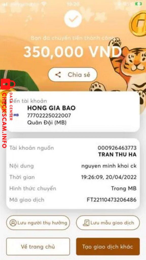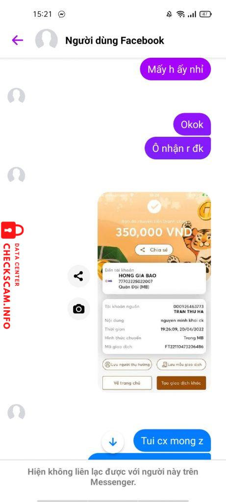 Scammer Alert: Hong Gia Bao Reported: November 16, 2024 Scammer Information Full Name: Hong Gia Bao Payment Gate: MB Payment Account: 77702225022007 Category: Marketplace scams Source: Checkscam Evidence Files Report Description Lừa đảo tiền xong xóa acc Comments Your comment Add Comment No comments yet. Be the first to share your experience with this scammer.