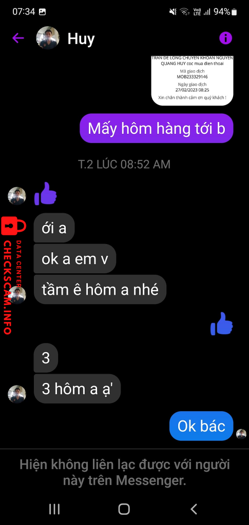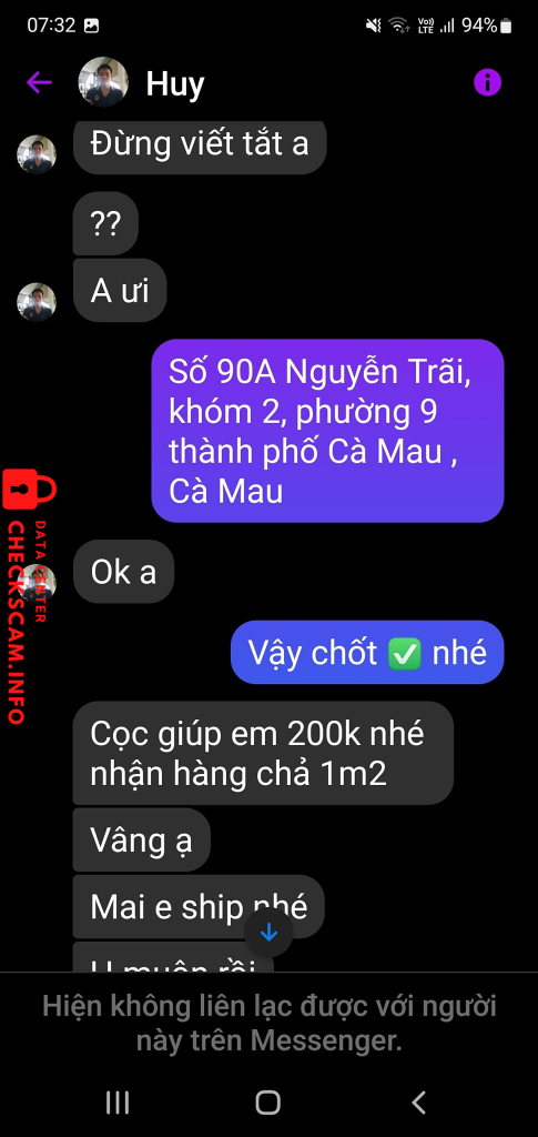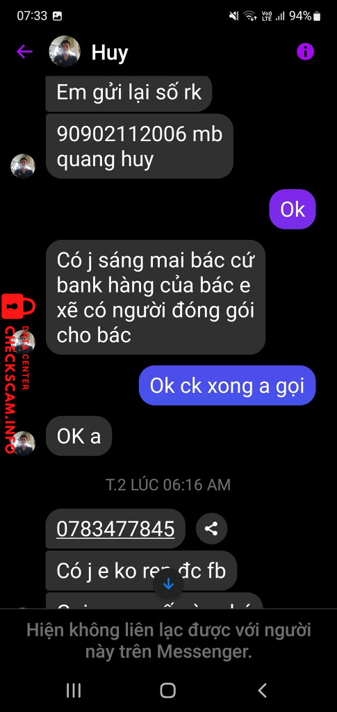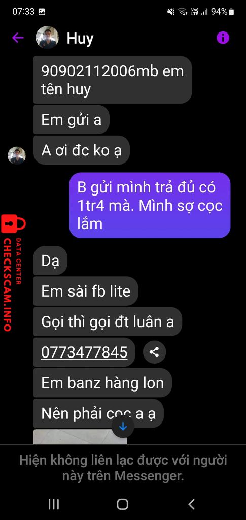 Scammer Alert: Huy Reported: November 16, 2024 Scammer Information Full Name: Huy Phone Number: 0773477845 Payment Gate: MB Bank Payment Account: 90902112006 Category: Marketplace scams Source: Checkscam Evidence Files Report Description Lừa đảo cọc 200k Comments Your comment Add Comment No comments yet. Be the first to share your experience with this scammer.