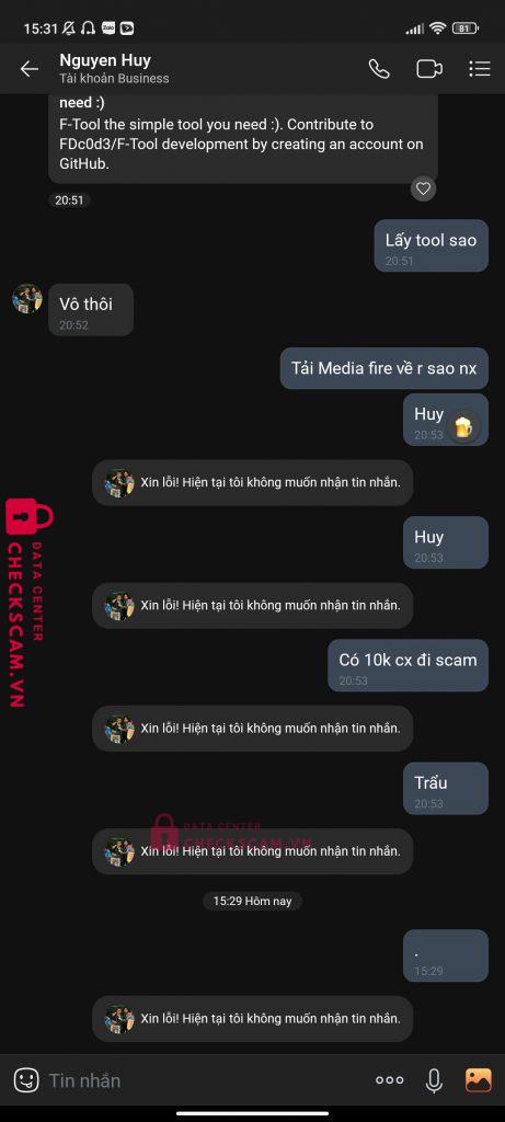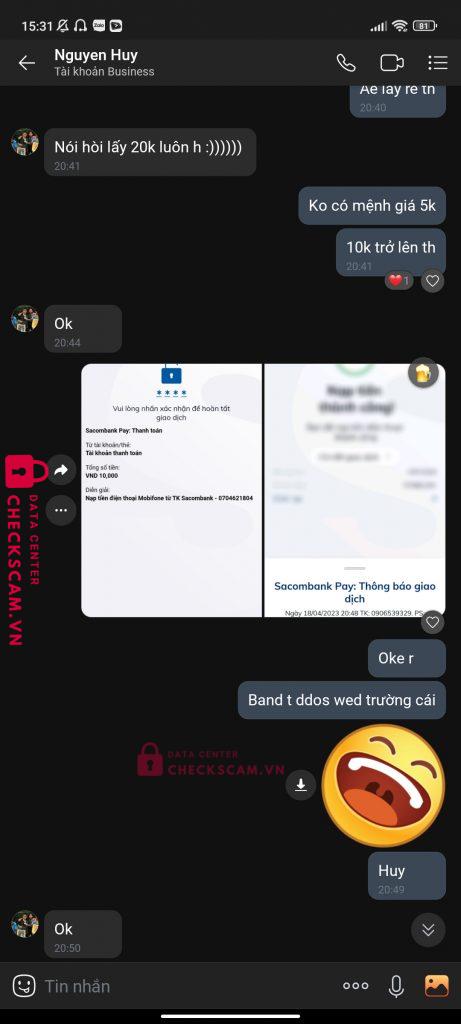 Scammer Alert: Huy Nguyen Reported: November 16, 2024 Scammer Information Full Name: Huy Nguyen Phone Number: 0704621804 Payment Gate: Mobile phone Payment Account: 0704621804 Category: Marketplace scams Source: Checkscam Evidence Files Report Description Người này lợi dụng lòng tin của tôi để mua hàng Comments Your comment Add Comment No comments yet. Be the first to share your experience with this scammer.