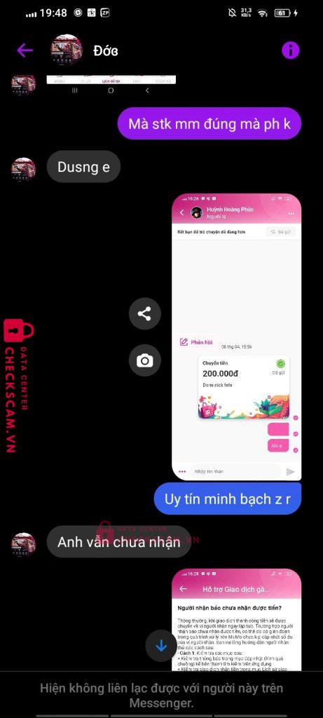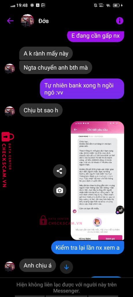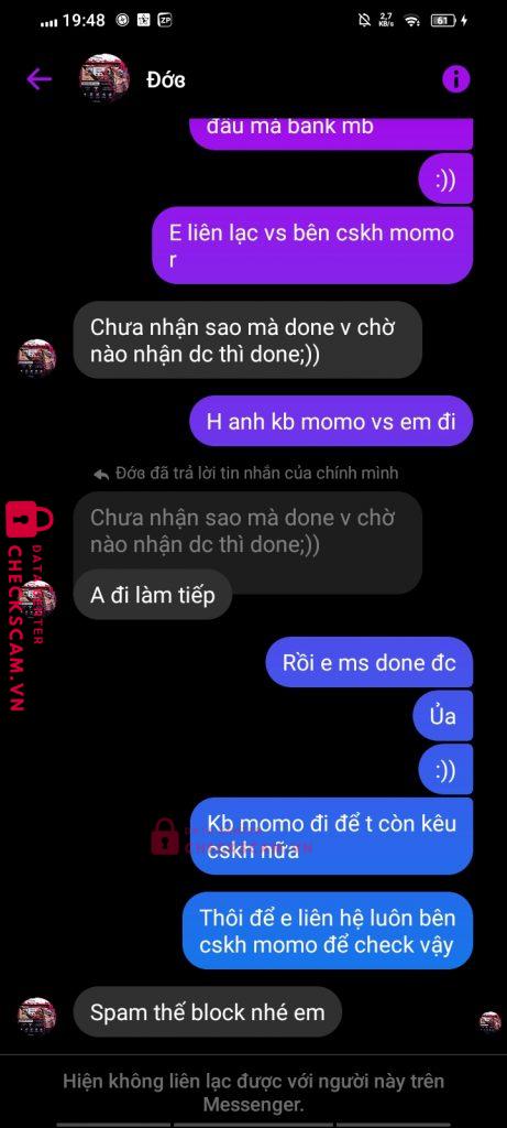Lừa đảo người khác bằng các bill giao dịch trên story facebook dụ những người nhẹ dạ cả tin giao dịch trực tiếp không qua trung gian để lừa đảo,chiếm đoạt số tiền người khác.Chuyển tiền momo thì bảo là không nhận được tiền,số giờ trên gói trái màn hình font chữ giống chỉnh sửa, báo cáo với cskh bên momo thì họ đã bảo nhận được tiền nhưng vẫn bao biệ,cãi cố còn bày trò có việc bận để gây mất thời gian.Đã lấy tiền người khác còn hù đòi block. Những thể loại súc sinh này không thể để cho nó tồn tại được.Cảm ơn mọi người đã đọc