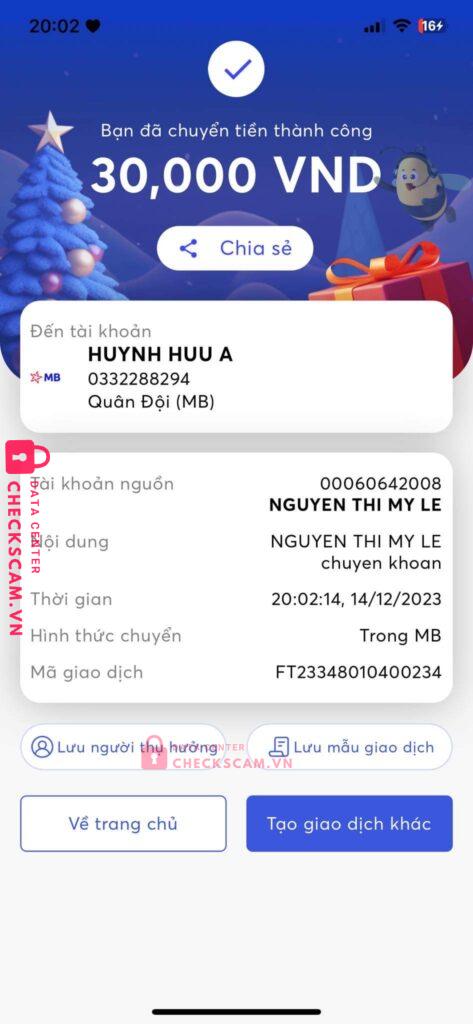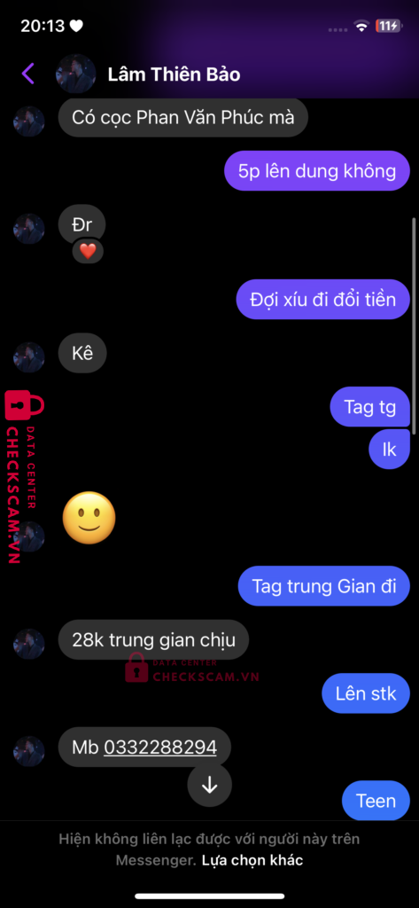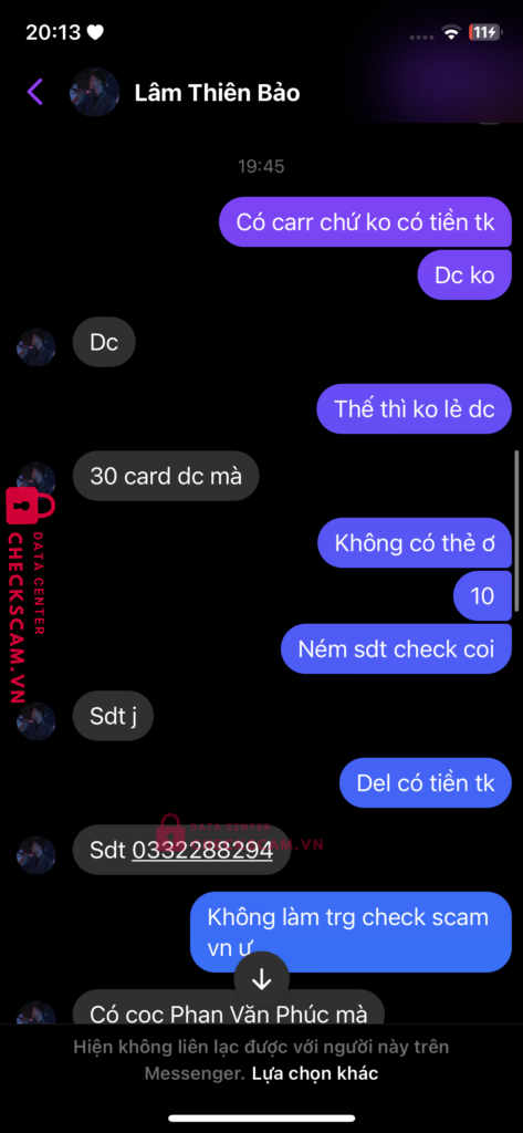 Scammer Alert: Huynh HUU A Reported: November 16, 2024 Scammer Information Full Name: Huynh HUU A Payment Gate: Mb Payment Account: 0332288294 Category: Marketplace scams Source: Checkscam Evidence Files Report Description Bán sub sì cam Comments Your comment Add Comment No comments yet. Be the first to share your experience with this scammer.