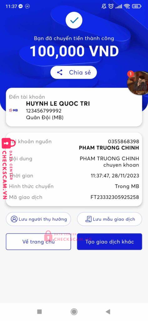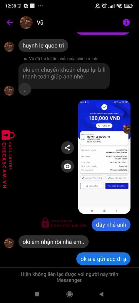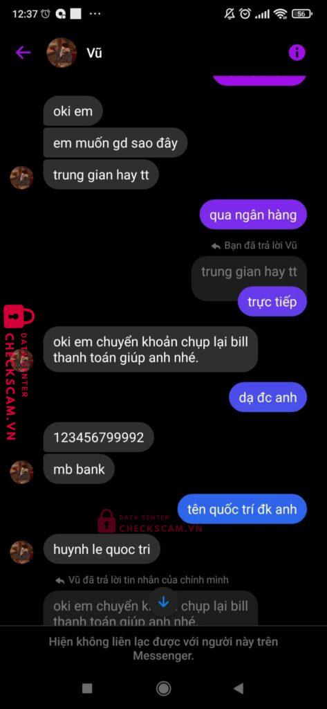 Scammer Alert: HUYNH LE QUOC TRI Reported: November 16, 2024 Scammer Information Full Name: HUYNH LE QUOC TRI Payment Gate: MB BANK Payment Account: 123456799992 Category: Marketplace scams Source: Checkscam Evidence Files Report Description Up bài bán acc trên Facebook rồi sau khi chuyển khoản tiền thì scam Comments Your comment Add Comment No comments yet. Be the first to share your experience with this scammer.