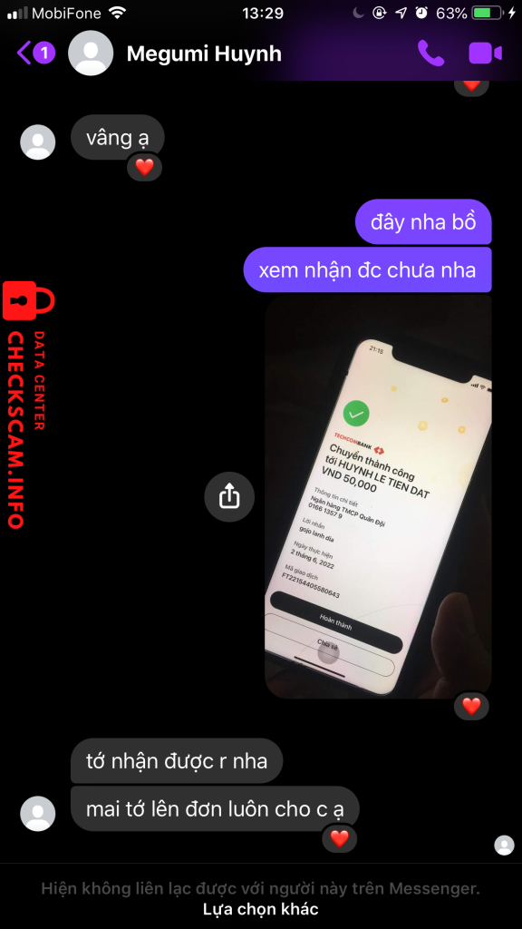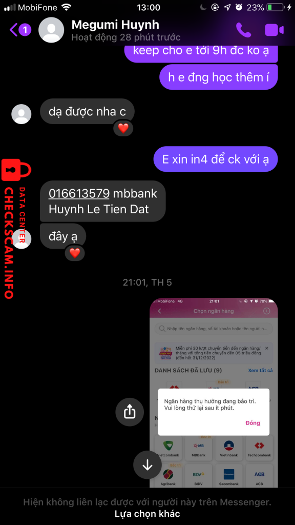 Scammer Alert: HUYNH LE TIEN DAT Reported: November 16, 2024 Scammer Information Full Name: HUYNH LE TIEN DAT Payment Gate: mb bank Payment Account: 016613579 Category: Marketplace scams Source: Checkscam Evidence Files Report Description bữa mua gộ 50k bả nói mai đưa hàng cho cuối cùng bị block luôn Comments Your comment Add Comment No comments yet. Be the first to share your experience with this scammer.