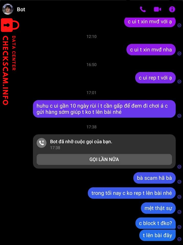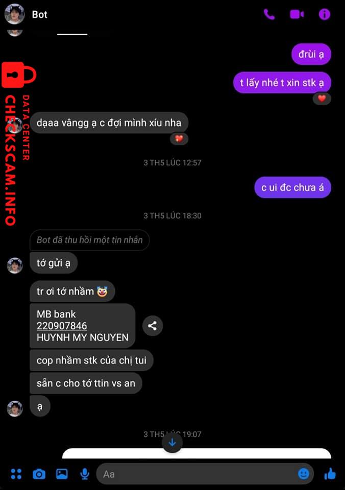 Scammer Alert: HUYNH MY NGUYEN Reported: November 16, 2024 Scammer Information Full Name: HUYNH MY NGUYEN Payment Gate: MB Bank Payment Account: 220907846 Category: Marketplace scams Source: Checkscam Evidence Files Report Description Khách đã ck trc r nhx k gửi hàng, quịt tiền của khách Comments Your comment Add Comment No comments yet. Be the first to share your experience with this scammer.