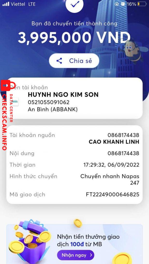tố cáo chủ tài khoản Huynh Ngo Kim Son tội danh lừa đảo, chiếm đoạt tài sản bằng hình thức onl. Hắn lừa đảo của tôi 17tr900k