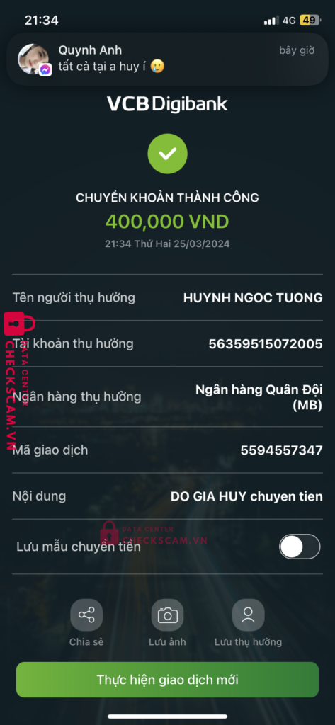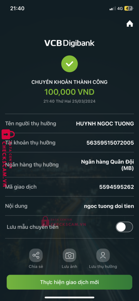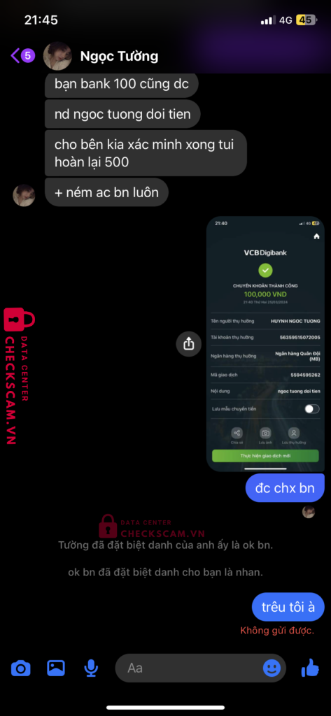 Scammer Alert: HUYNH NGOC TUONG Reported: November 16, 2024 Scammer Information Full Name: HUYNH NGOC TUONG Payment Gate: MB BANK Payment Account: 56359515072005 Category: Marketplace scams Source: Checkscam Evidence Files Report Description tôi mua acc fifa nhưng mà nó cứ bảo chuyển tiền xong chặn luôn Comments Your comment Add Comment No comments yet. Be the first to share your experience with this scammer.