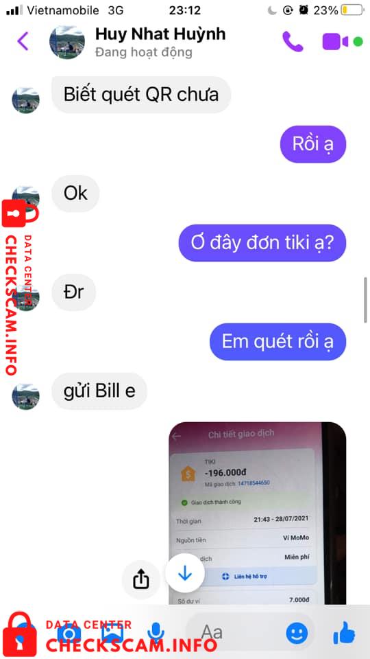 Nửa đêm rồi mà phát bực, em mất sạch 196k trong tài khoản (số tiền nhỏ nhưng đối với đứa học sinh như em thì nó không nhỏ đâu ạ). Từ lúc em check đơn hiện ra đơn tiki em đã nghi rồi, không cần áp mã giảm giá gì mà đã thanh toán. Anh này bảo em quét thêm đơn nữa rồi mới check nhưng em thấy không ổn rồi nên em không liều nữa. Cứ giằng co xong anh bảo chờ anh, em chờ nửa tiếng nhắn lại vẫn không thấy phản hồi gì, lúc sau mới câu được câu chăng xuất hiện, vẫn muốn lừa thêm 196k nữa nhưng em cũng không ngu đến mức đấy!! Cuối cùng bây giờ xoá nick rồi em không nhắn được nữa.