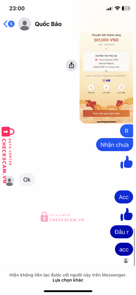 Scammer Alert: HUYNH THI THU HA Reported: May 10, 2025 Scammer Information Full Name: HUYNH THI THU HA Payment Gate: TECKCOMBANK Payment Account: 19073077986012 Category: Marketplace scams Source: Checkscam Evidence Files Report Description Scam tiền Comments Your comment Add Comment No comments yet. Be the first to share your experience with this scammer.