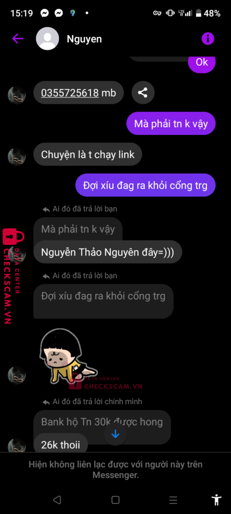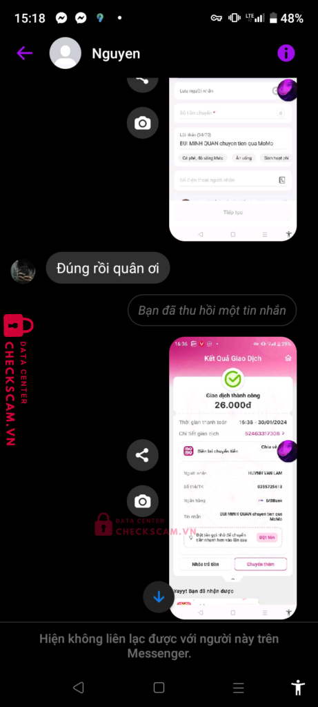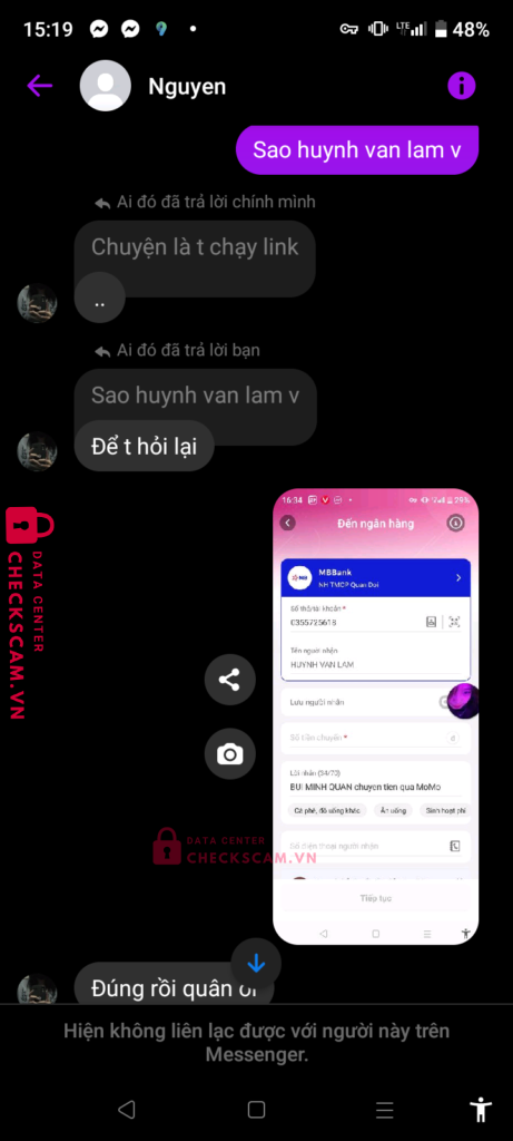 Scammer Alert: HUYNH VAN LAM Reported: November 16, 2024 Scammer Information Full Name: HUYNH VAN LAM Payment Gate: MB BANK Payment Account: 0355725618 Category: Marketplace scams Source: Checkscam Evidence Files Report Description Scam link conin Comments Your comment Add Comment No comments yet. Be the first to share your experience with this scammer.