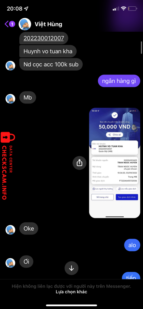 Scammer Alert: Huynh Vo Tuan Kha Reported: November 16, 2024 Scammer Information Full Name: Huynh Vo Tuan Kha Payment Gate: Mb Bank Payment Account: 202230012007 Category: Marketplace scams Source: Checkscam Evidence Files Report Description Đầu tiên tôi mua acc của họ xog họ bảo acc bị 956 tôi bảo họ hoàn lại tiền nhưng họ bảo ko tôi yêu cầu check scam có thể duyệt bài này Comments Your comment Add Comment No comments yet. Be the first to share your experience with this scammer.