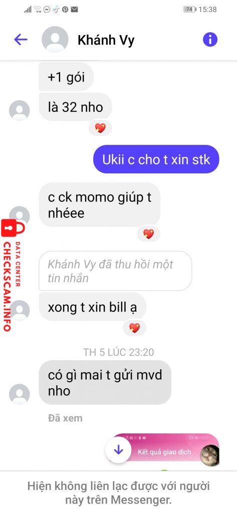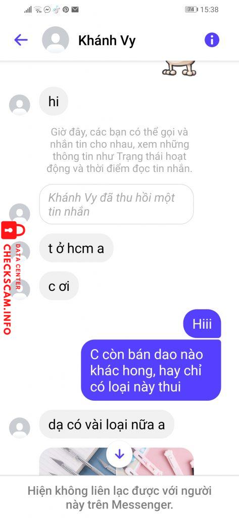 Mình mua dao rọc giấy b này lúc đầu mình hỏi ở đâu thì bảo ở Nghệ An, nhưng sau đó lại thu hồi tin nhắn và nhắn lại là ở HCM mình không chú ý nhiều nên cũng bỏ qua. Mng nhìn vào hình cũng có thể thấy bạn ấy hối mình mua ntn, nhưng mình nghĩ bạn ấy muốn bán hàng nên cũng chọn lẹ hơn thôi, sau khi nt qua lại thì mình xin stk để ck. Ck xong xuôi thì bạn ấy bảo sẽ gửi mvd sau cho mình. Qua mấy ngày không thấy đơn thì mình nhắn hỏi, có thể thấy trong hình là bạn ấy trả lời rất mập mờ, rồi cuối cùng là mình ăn block. Mình lướt lên lại thấy bạn ấy thu hồi lại số momo mà lúc trc đã gửi cho mình, nên cũng chắc chắn bản thân đã bị scam
