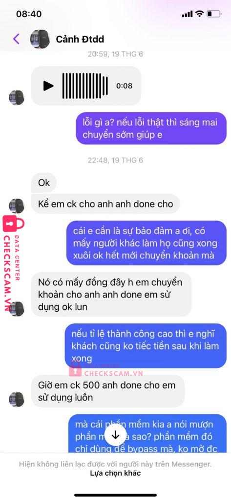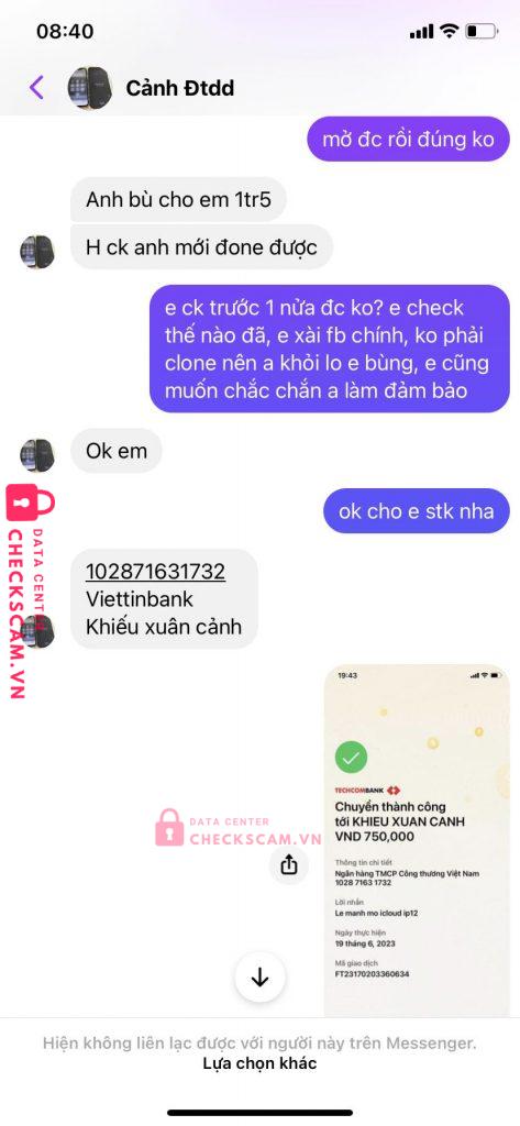 Đối tượng này nhận mở Icloud iphone giá rẻ, làm online không cần tới trực tiếp, nhưng hỏi địa chỉ cũng nói chung chung ở Long An. Báo giá xong hướng dẫn rồi nó làm tới khi gần xong gửi 1 tấm hình nói gần xong rồi kêu chuyển khoản, hỏi chuyển 1 nửa trước được không thì được rồi nó làm tiếp. Sau đó báo lại kêu mình đưa stk nó chuyển tiền lại vì sếp nói chuyển 1 nửa không làm được, nếu từ dầu nói vậy thì đã không chuyển rồi. Thấy bất an nên kiểm tra lại thì thấy nó ghép số máy của mình vào cái hình nó làm trong khi thực chất phần đó không hiển thị số gì. Nó lấy tính mạng gia đình ra đảm bảo không ghép. Sau đó thuyết phục chuyển phần còn lại để nó làm cho xong, mình không đồng ý nó kêu vậy để nó chuyển lại nhưng báo lỗi ngân hàng. Tới đây biết lừa rồi nhưng sau đó tiếp tục kỳ kèo trả giá xuống dần 500k rồi 300k rồi cho thêm nhiêu cũng được, cuối cùng block mình. Đối tượng đã từng nhiều lần lừa người khác với hình thức tương tự với nhiều nick facbook khác nhau. Mình có được hình ảnh, clip, ghi âm giọng nói của nó và địa chỉ từ những người khác bị lừa có được là 75, Định Công, Hà Nội tuy nhiên có thể là nhà bố mẹ, còn đối tượng thì vào nam lừa đảo.