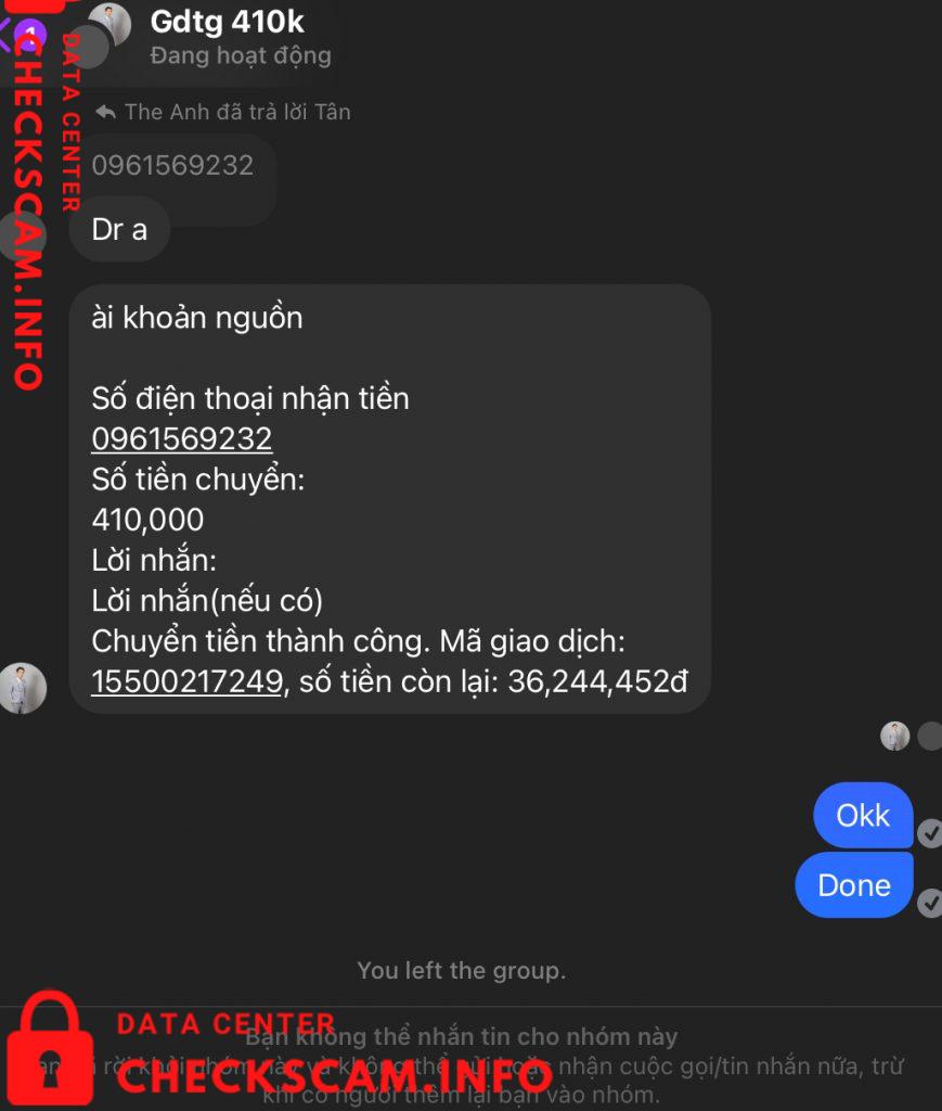 Scammer Alert: Khong Ngoc Giao Reported: November 16, 2024 Scammer Information Full Name: Khong Ngoc Giao Phone Number: 0961569232 Payment Gate: Momo Payment Account: 0961569232 Category: Marketplace scams Source: Checkscam Evidence Files Report Description Back acc 500 Comments Your comment Add Comment No comments yet. Be the first to share your experience with this scammer.