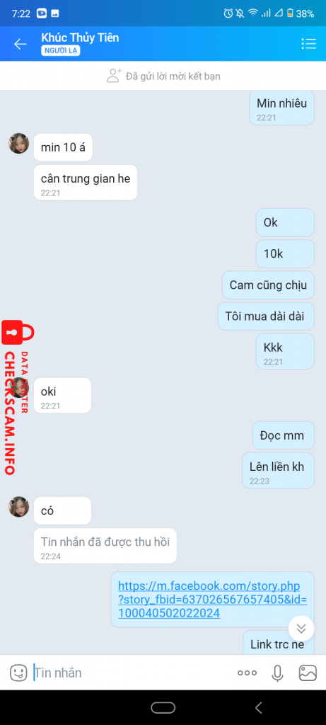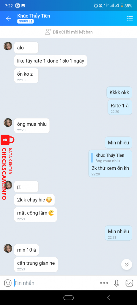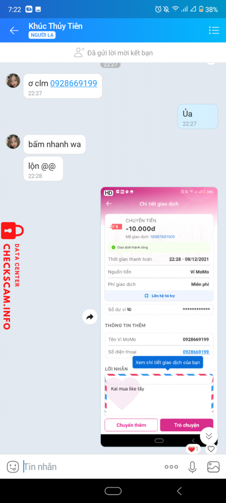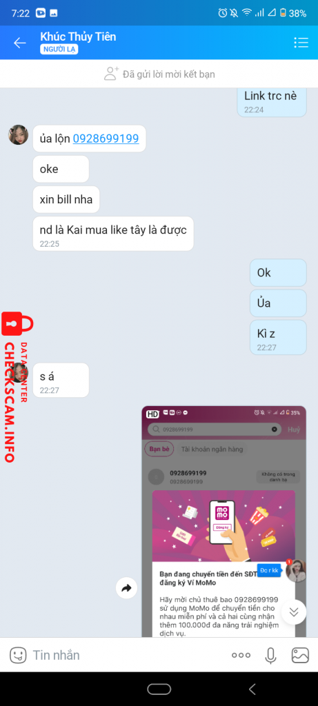 Scammer Alert: Khúc Thủy Tiên Reported: November 16, 2024 Scammer Information Full Name: Khúc Thủy Tiên Phone Number: 0928669199 Payment Gate: MOMO Payment Account: 0928669199 Category: Marketplace scams Source: Checkscam Evidence Files Report Description Scam buff like tây Comments Your comment Add Comment No comments yet. Be the first to share your experience with this scammer.