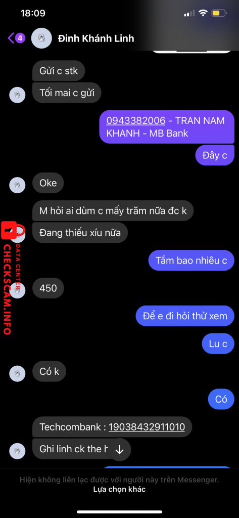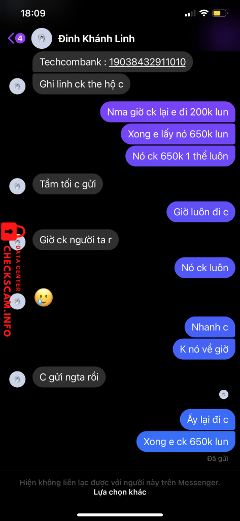 Scammer Alert: KIEU THI THANH HUYEN Reported: November 16, 2024 Scammer Information Full Name: KIEU THI THANH HUYEN Payment Gate: VietinBank Payment Account: 109873930601 Category: Marketplace scams Source: Checkscam Evidence Files Report Description Stk KIEU THI THANH HUYEN LỪA ĐẢO Comments Your comment Add Comment No comments yet. Be the first to share your experience with this scammer.