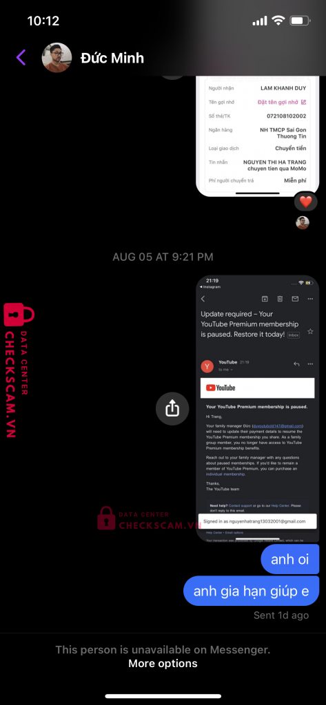 Scammer Alert: Lam Khanh Duy Reported: November 16, 2024 Scammer Information Full Name: Lam Khanh Duy Payment Gate: sacombank Payment Account: 072108102002 Category: Marketplace scams Source: Checkscam Evidence Files Report Description Ai định mua spotify hoặc youtube premium thì né con chó này ra nhé. tiên sư cha lừa đảo Comments Your comment Add Comment No comments yet. Be the first to share your experience with this scammer.