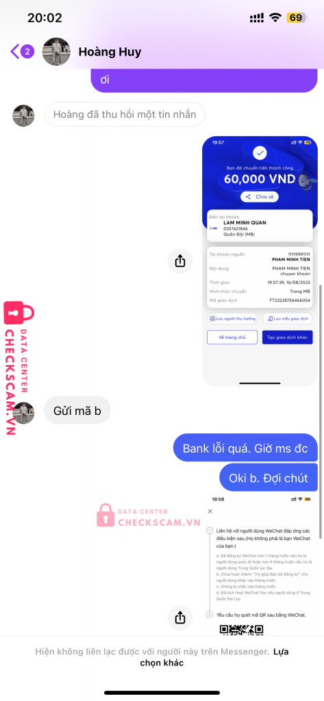 Scammer Alert: Lam Minh Quan Reported: November 16, 2024 Scammer Information Full Name: Lam Minh Quan Phone Number: 0357421846 Payment Gate: Mb bank Payment Account: 0357421846 Category: Marketplace scams Source: Checkscam Evidence Files Report Description Lừa đảo quét wechat Comments Your comment Add Comment No comments yet. Be the first to share your experience with this scammer.