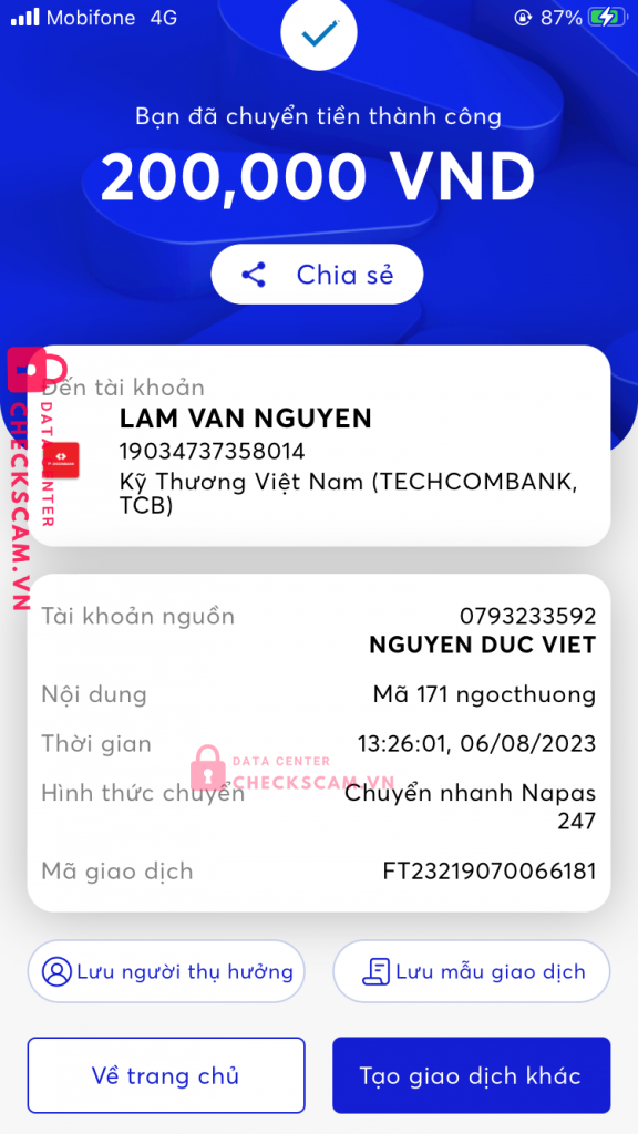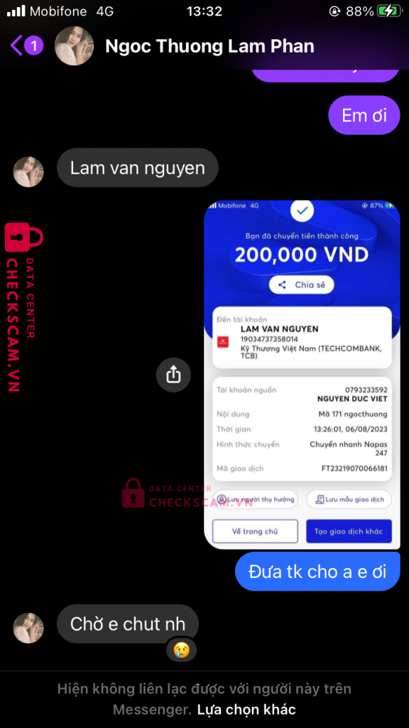 Scammer Alert: Lam Van Nguyen Reported: November 16, 2024 Scammer Information Full Name: Lam Van Nguyen Payment Gate: TECHCOMBANK Payment Account: 19034737358014 Category: Marketplace scams Source: Checkscam Evidence Files Report Description Lừa đảo Comments Your comment Add Comment No comments yet. Be the first to share your experience with this scammer.