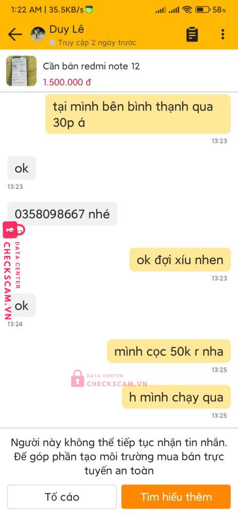 Scammer Alert: Le Anh Duy Reported: November 16, 2024 Scammer Information Full Name: Le Anh Duy Payment Gate: Momo + zalo Payment Account: 0358098667 Category: Marketplace scams Source: Checkscam Evidence Files Report Description Lừa đảo lấy tiền cọc, địa chỉ nhà: 418 phan huy ích , p14 gò vấp Comments Your comment Add Comment No comments yet. Be the first to share your experience with this scammer.