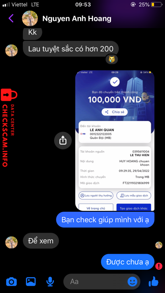 Scammer Alert: LE ANH QUAN Reported: November 16, 2024 Scammer Information Full Name: LE ANH QUAN Payment Gate: Mbbank Payment Account: 0012322122005 Category: Marketplace scams Source: Checkscam Evidence Files Report Description Scam tiền Comments Your comment Add Comment No comments yet. Be the first to share your experience with this scammer.