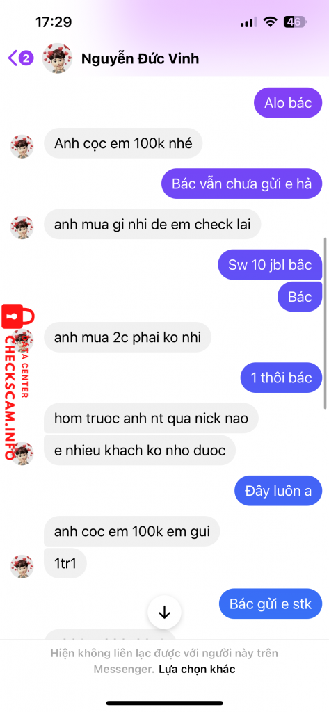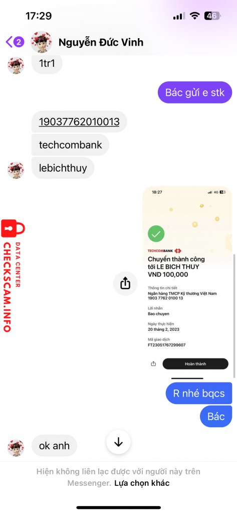 Scammer Alert: Le Bich Thuy Reported: November 16, 2024 Scammer Information Full Name: Le Bich Thuy Payment Gate: Techcombank Payment Account: 19037762010013 Category: Marketplace scams Source: Checkscam Evidence Files Report Description Lừa cọc nhé mọi người Comments Your comment Add Comment No comments yet. Be the first to share your experience with this scammer.