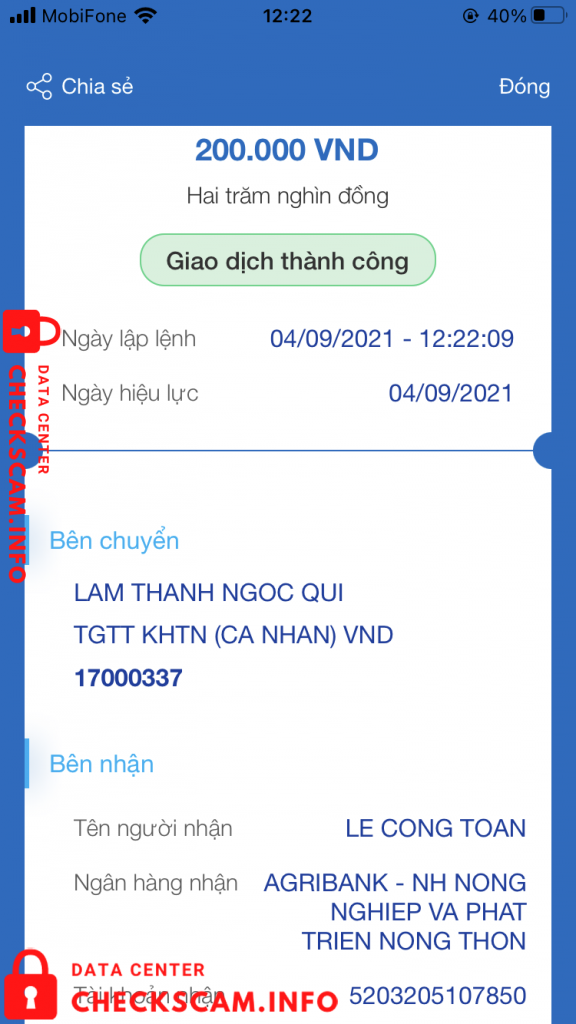 Scammer Alert: Lê Công Toàn Reported: November 16, 2024 Scammer Information Full Name: Lê Công Toàn Payment Gate: Agribank Payment Account: 5203205107850 Category: Marketplace scams Source: Checkscam Evidence Files Report Description Lừa đảo cọc tiền, khi chốt xong lại chặn Facebook. Comments Your comment Add Comment No comments yet. Be the first to share your experience with this scammer.