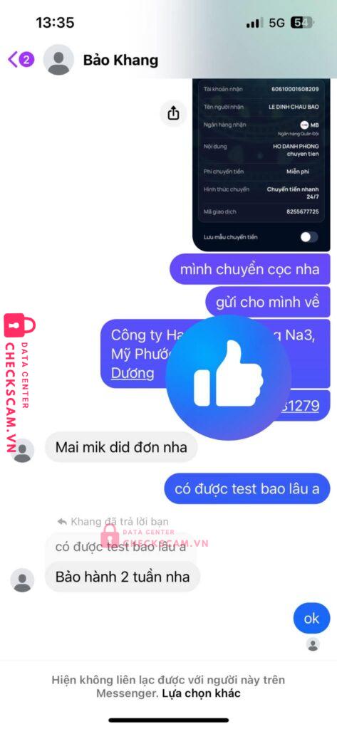 Scammer Alert: LE DINH CHAU BAO Reported: March 7, 2025 Scammer Information Full Name: LE DINH CHAU BAO Payment Gate: MB BANK Payment Account: 60610001608209 Category: Marketplace scams Source: Checkscam Evidence Files Report Description Lừa tiền cọc Comments Your comment Add Comment No comments yet. Be the first to share your experience with this scammer.