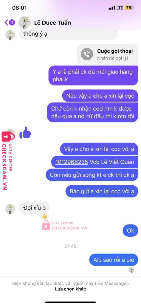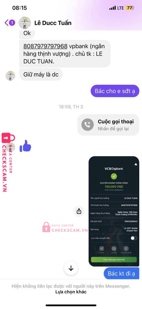 Scammer Alert: LE DUC TUAN Reported: November 16, 2024 Scammer Information Full Name: LE DUC TUAN Payment Gate: VPBANK Payment Account: 8087979797968 Category: Marketplace scams Source: Checkscam Evidence Files Report Description cọc tiền mua máy bị lừa đảo Comments Your comment Add Comment No comments yet. Be the first to share your experience with this scammer.
