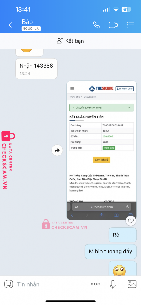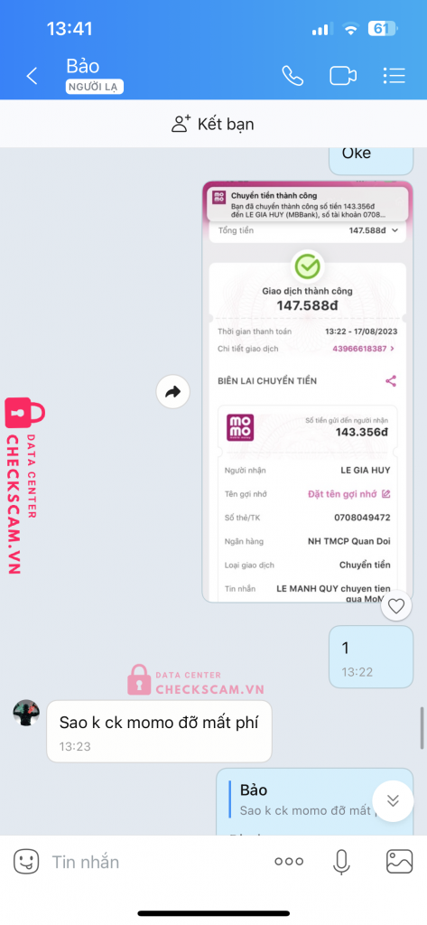 Scammer Alert: Lê gia Huy Reported: November 16, 2024 Scammer Information Full Name: Lê gia Huy Phone Number: 0708049472 Payment Gate: Mb bank Payment Account: 0708049472 Category: Marketplace scams Source: Checkscam Evidence Files Report Description Scam 350k tiền rb Comments Your comment Add Comment No comments yet. Be the first to share your experience with this scammer.