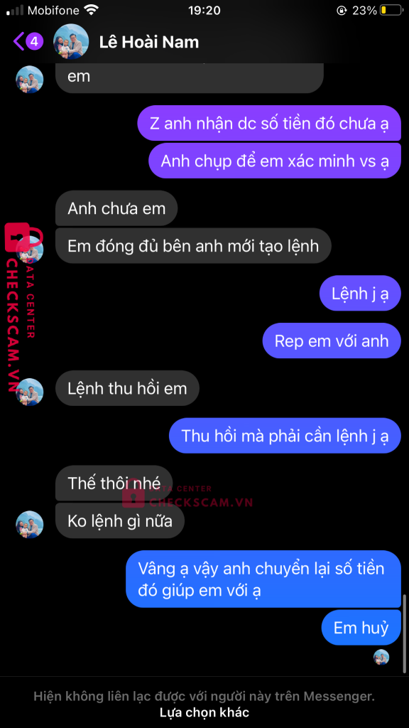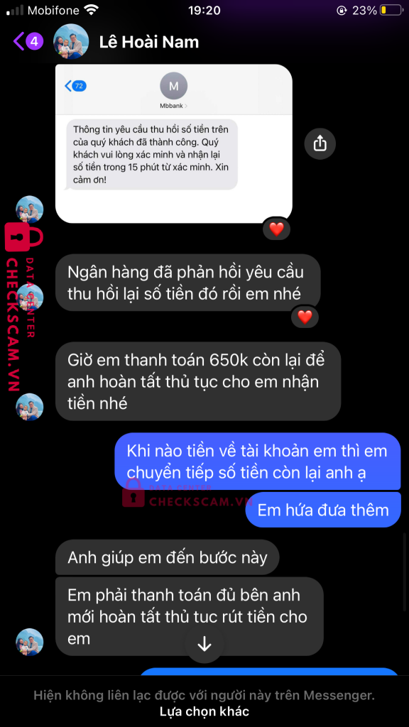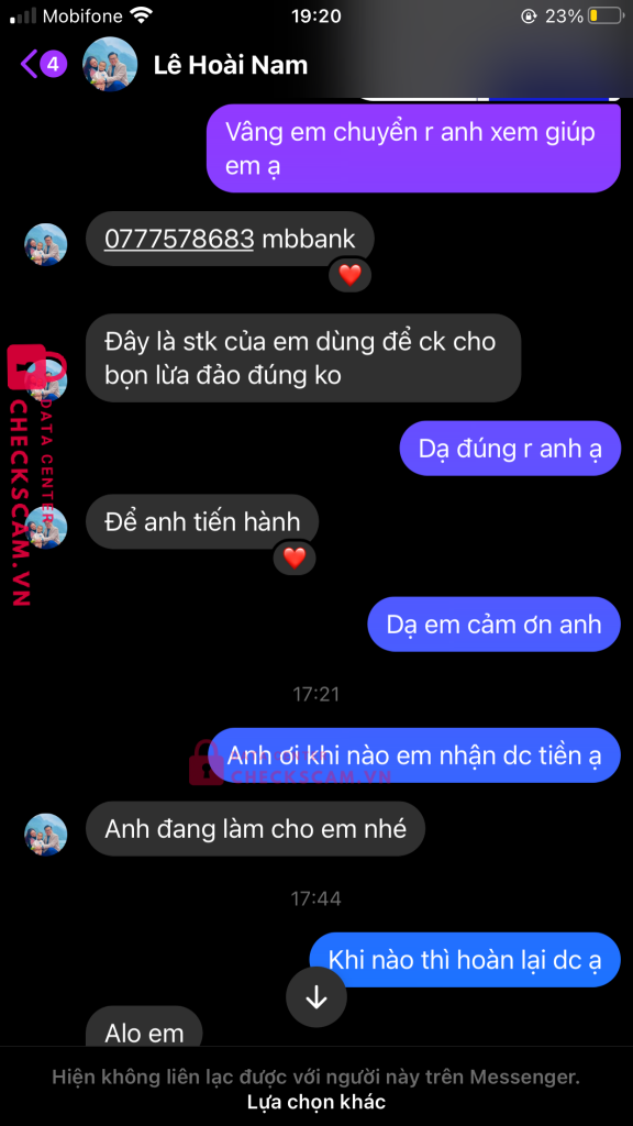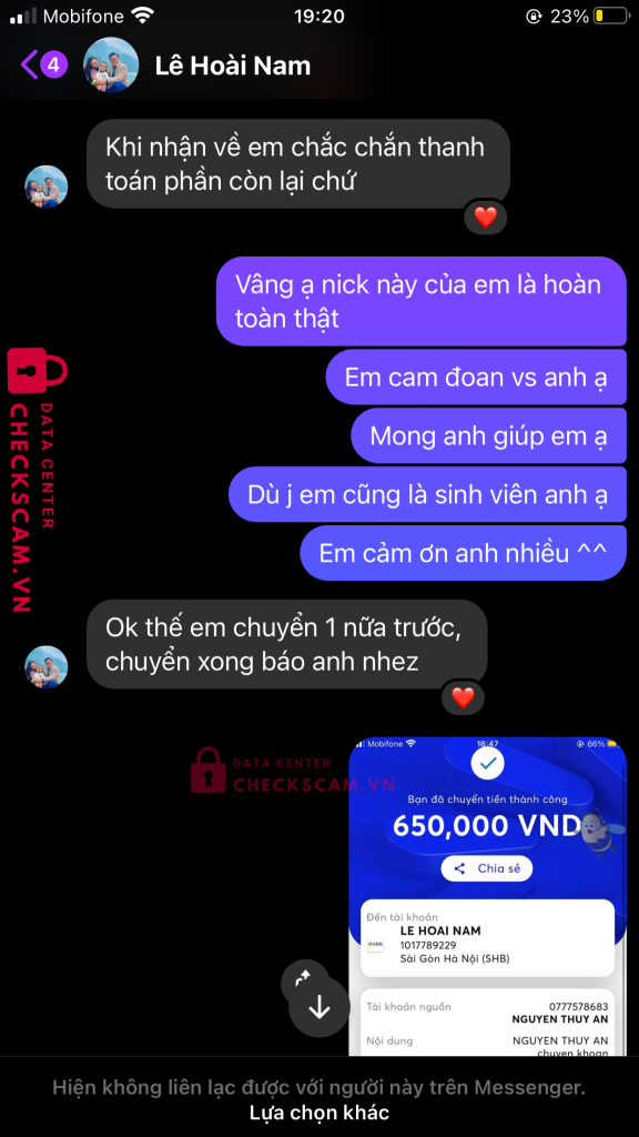 Scammer Alert: LE HOAI NAM Reported: November 16, 2024 Scammer Information Full Name: LE HOAI NAM Payment Gate: NGÂN HÀNG SÀI GÒN HÀ NỘI (SHB) Payment Account: 1017789299 Category: Marketplace scams Source: Checkscam Evidence Files Report Description MANG DANH LÀ GIÚP NGƯỜI BỊ LỪA ĐẢO QUA MẠNG LẤY LẠI TIỀN ĐÃ MẤT ĐỂ TIẾP TỤC LỪA NHỮNG NẠN NHÂN NHẸ DẠ VÀ CẢ TIN!!!! Comments Your comment Add Comment No comments yet. Be the first to share your experience with this scammer.
