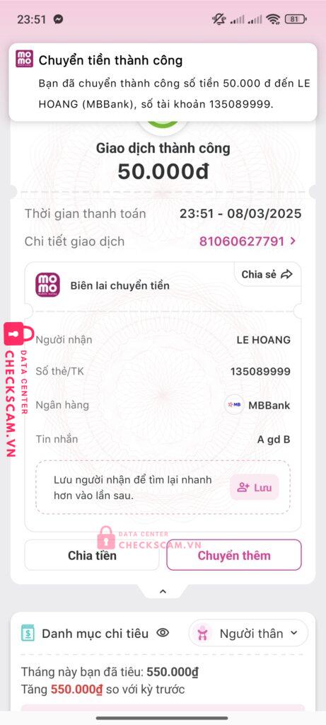 Scammer Alert: LE HOANG Reported: May 10, 2025 Scammer Information Full Name: LE HOANG Payment Gate: MB Bank Payment Account: 135089999 Category: Marketplace scams Source: Checkscam Evidence Files Report Description em bị scam 100k ban đầu em chuyển 50k rồi nó bắt em chuyển tiếp 50k với nd A gd B xong rồi nó kêu đi xem đá bóng rồi chặn em luôn Comments Your comment Add Comment No comments yet. Be the first to share your experience with this scammer.
