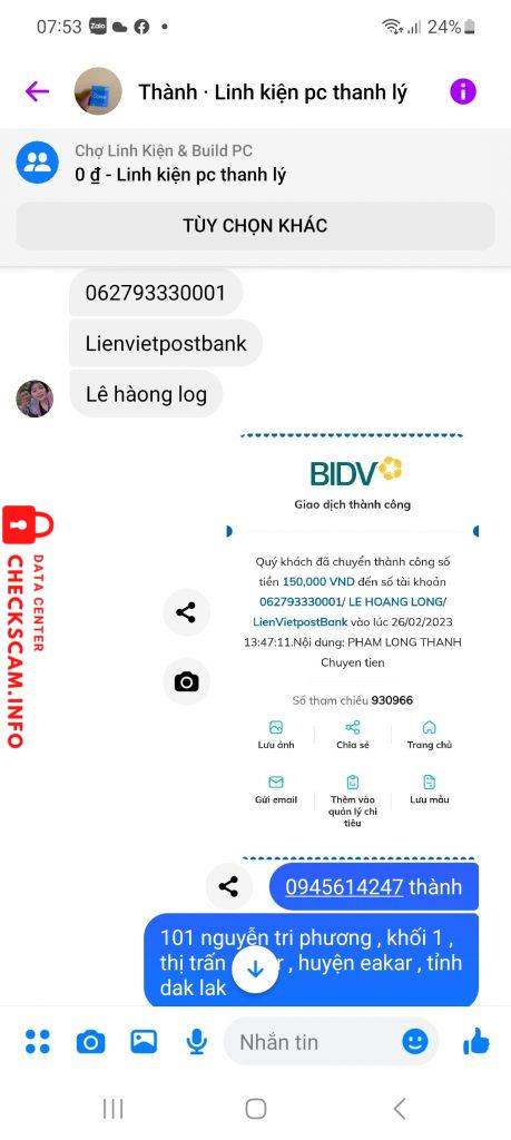 Scammer Alert: Lê Hoàng Long Reported: November 16, 2024 Scammer Information Full Name: Lê Hoàng Long Payment Gate: Lienvietpostbank Payment Account: 062793330001 Category: Marketplace scams Source: Checkscam Evidence Files Report Description Chuyển tiền nhưng ko gửi hàng , nhắn tin chỉ xem chứ ko trả lời Comments Your comment Add Comment No comments yet. Be the first to share your experience with this scammer.