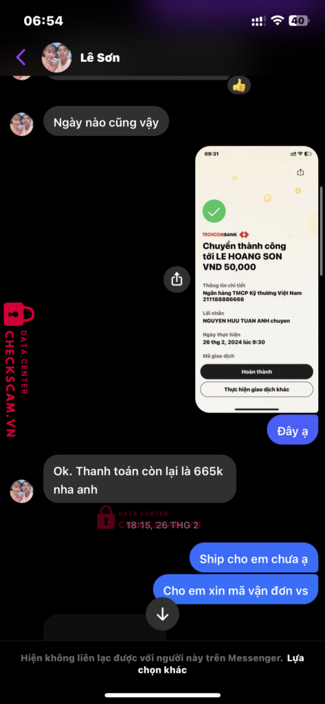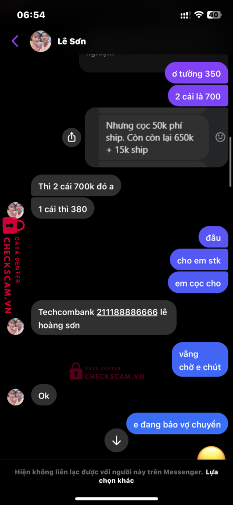 Scammer Alert: Lê Hoàng Sơn Reported: November 16, 2024 Scammer Information Full Name: Lê Hoàng Sơn Payment Gate: Techcombank Payment Account: 211188886666 Category: Marketplace scams Source: Checkscam Evidence Files Report Description Bán hàng online chuyên lừa đảo. Hàng giao đến toàn là hàng lỗi, hàng tàu rẻ rách con chó này ở sg nha m.n cảnh giác Comments Your comment Add Comment No comments yet. Be the first to share your experience with this scammer.