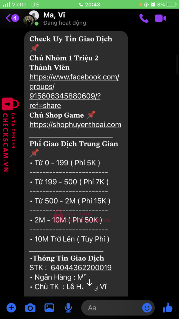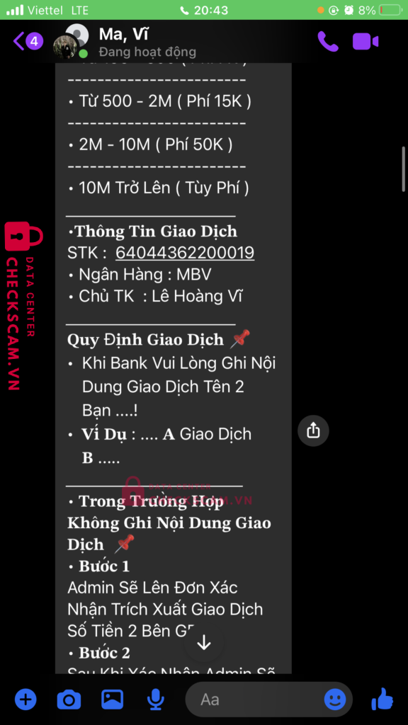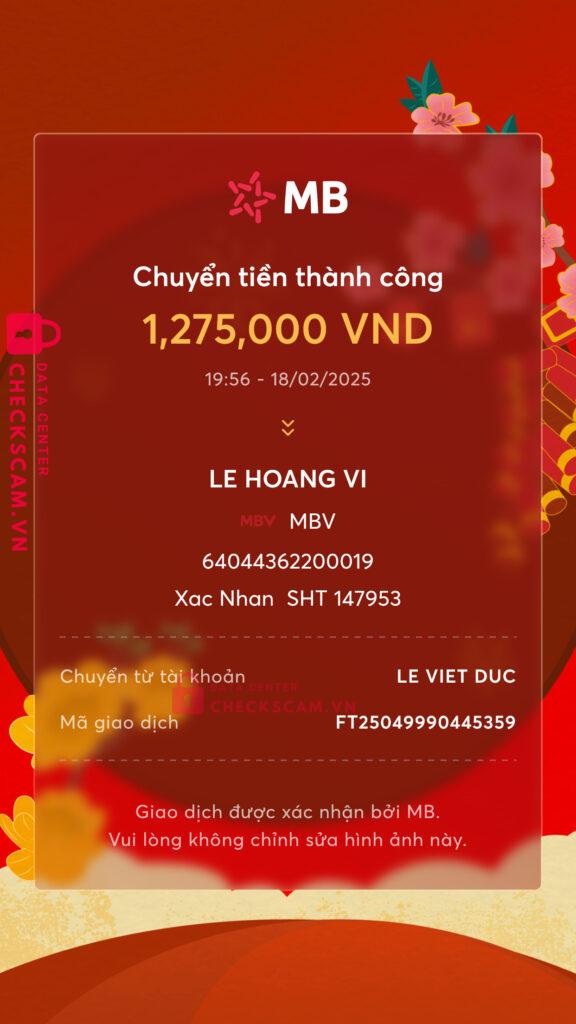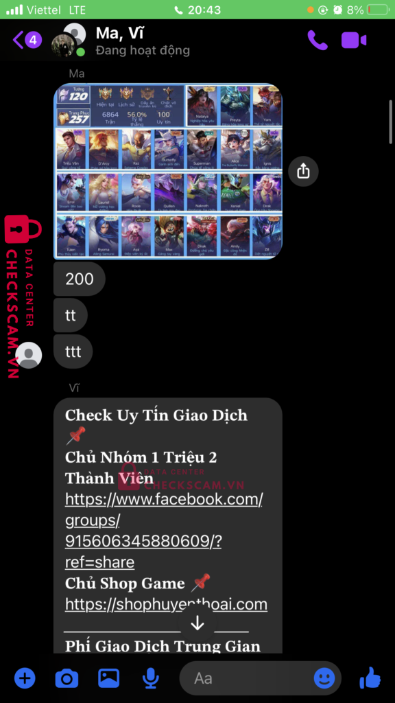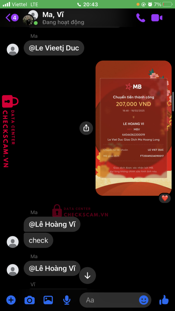 tôi mua acc liên quân 200k, tôi chuyển 207k với 7k là phí giao dịch, nhưng với lý do chuyển sai nội dung, nó yêu cầu chuyển thêm 414k với lý do là hoàn giao dịch, sau đó nó lại yêu cầu chuyển thêm 1 triệu 275 với cùng lý do như vậy, sau đó nó đòi thêm 3 triệu 750 nhưng lần này tôi không chuyển. tổng số tiền tôi bị lừa là một triệu tám trăm chín mươi sáu nghìn đồng.