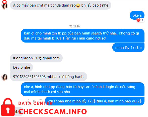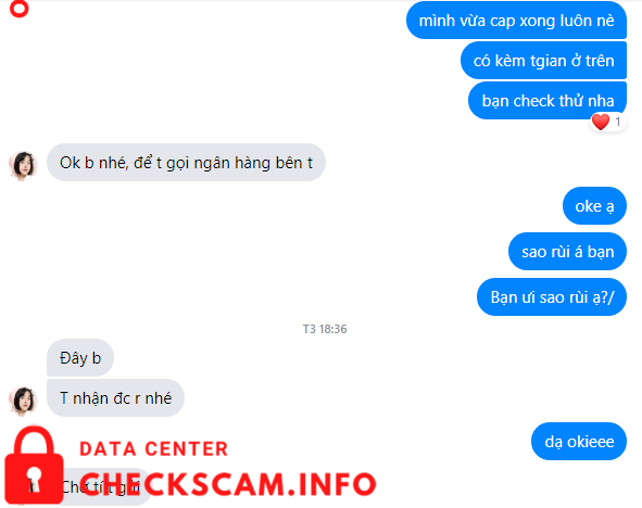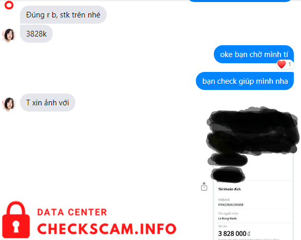 Scammer Alert: Lê Hồng Hạnh Reported: November 16, 2024 Scammer Information Full Name: Lê Hồng Hạnh Payment Gate: MB BANK Payment Account: 9704229261395698 Category: Marketplace scams Source: Checkscam Evidence Files Report Description Lừa đảo qua chuyển khoản, sau khi nhận tiền block luôn Comments Your comment Add Comment No comments yet. Be the first to share your experience with this scammer.