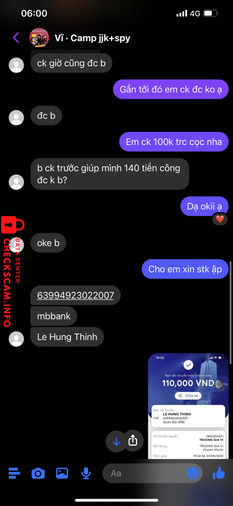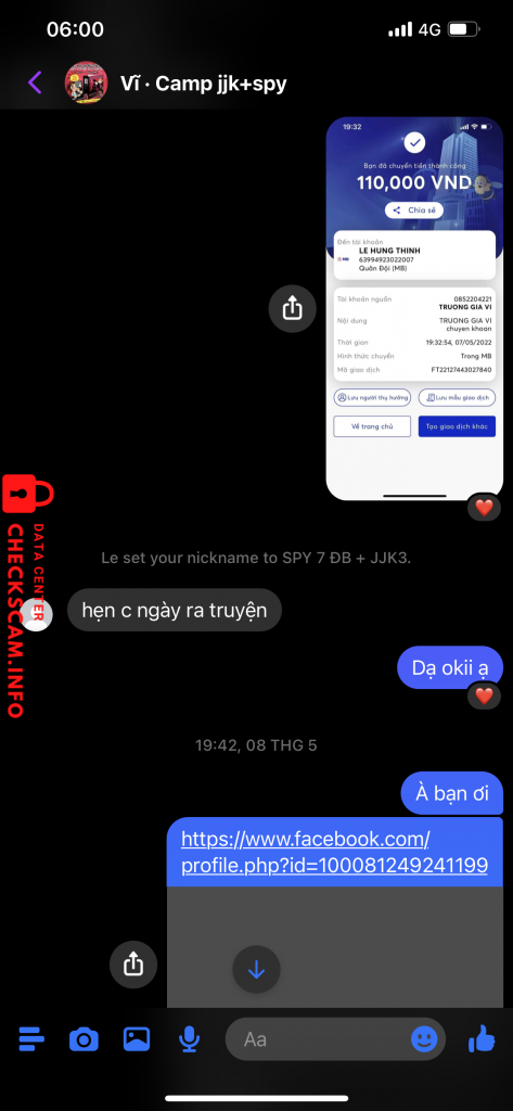 Scammer Alert: Lê hưng thịnh Reported: November 16, 2024 Scammer Information Full Name: Lê hưng thịnh Payment Gate: MB Bank Payment Account: 63994923022007 Category: Marketplace scams Source: Checkscam Evidence Files Report Description Lừa đảo gr bán truyện Comments Your comment Add Comment No comments yet. Be the first to share your experience with this scammer.