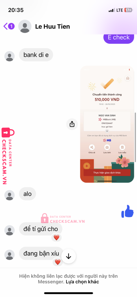 Scammer Alert: LE HUU TIEN Reported: March 7, 2025 Scammer Information Full Name: LE HUU TIEN Payment Gate: Mb bank Payment Account: 20102008040200 Category: Marketplace scams Source: Checkscam Evidence Files Report Description Scam nha ae lưu ý nếu có gd pk giam ít nhất 7day Comments Your comment Add Comment No comments yet. Be the first to share your experience with this scammer.